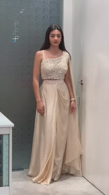 A contemporary dhoti-style saree set crafted in premium crape silk, designed to deliver a modern yet elegant festive look. Featuring intricate multi-thread embroidery with sequence detailing, this ready-look ensemble combines traditional draping with a stylish silhouette, making it ideal for parties, festive occasions, and special events.