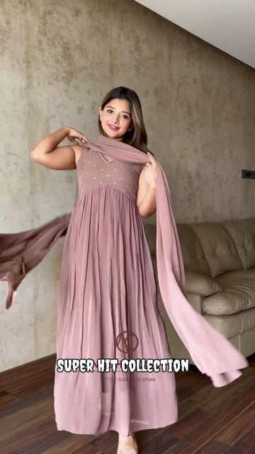 A stunning designer party wear gown set crafted in heavy faux georgette with rich embroidery sequins work. Designed with a beautiful 4-meter flair for a grand flowy look, paired with a comfortable stitched pant and an elegant lace-work dupatta—perfect for festive and party occasions.