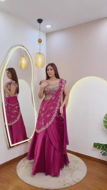 A trending indo-western lehenga style saree set crafted in premium crep silk, designed for a modern festive look. Featuring embroidery sequins work with an attached pallu drape, paired with a ready-to-wear blouse, this ensemble offers a stylish and comfortable outfit for celebrations and occasions.
